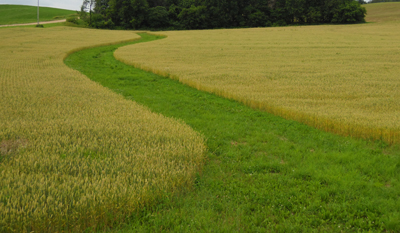 A grassed waterway is just what it is called. This is a furrow for water streams covered with grass. It is connected to a ditch, pit, or current to collect water, and the grassroots keep the earth in place, protecting it from water erosion, and thus contributing to soil conservation